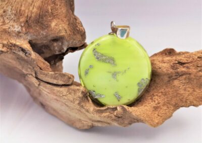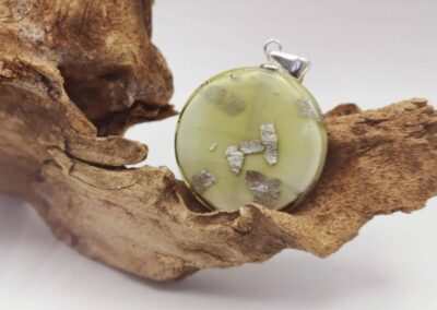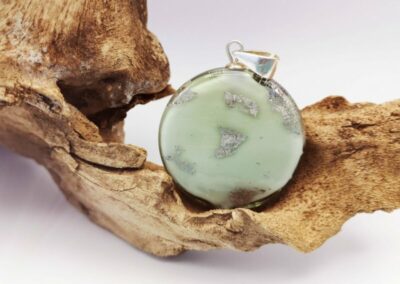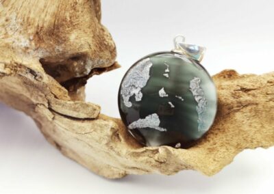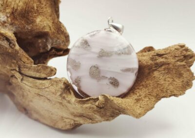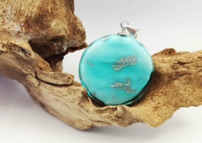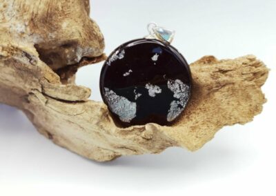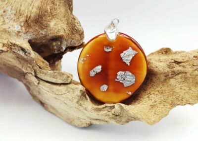 Anhänger aus selbst gefertigter Glasperle mit Blattsilber, beidseitig gemustert.