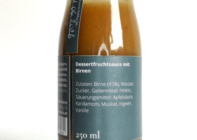 Zutaten: Birnen (45%), Wasser, Zucker, Geliermittel: Pektin, Säuerungsmittel: Apfelsäure, Kardamom, Muskat, Ingwer, Vanille