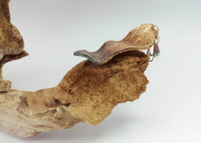 Und hier passend zu den Ohrringen und Ringen ein Anhänger. Er stammt von einem Salbeiblatt aus meinem Garten und ist beidseitig gemustert. Die geschwungene Form unterstreicht die Lebendigkeit des Motivs. Der Anhänger kann wunderbar halsnah, aber auch an einer langen Kette getragen werden. Um die Struktur des Blattes hervorzuheben habe ich ihn patiniert (mittel Kaliumsulfid geschwärzt). Jedes Stück ein Unikat.